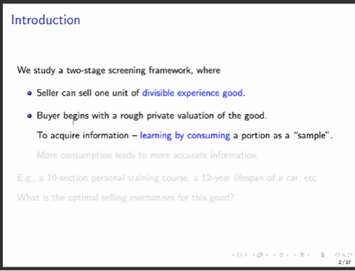 讲座首先介绍了研究背景。这是对于收入最大化机制的研究,其中卖方分两个阶段向买方出售一个单位的可分割商品。在第一阶段,买方可以依靠他对商品的私人粗略估价来确定他的第一阶段消费水平。更多的消费使得第二阶段对商品的私人估值更准确,之后他确定他的第二阶段消费水平。