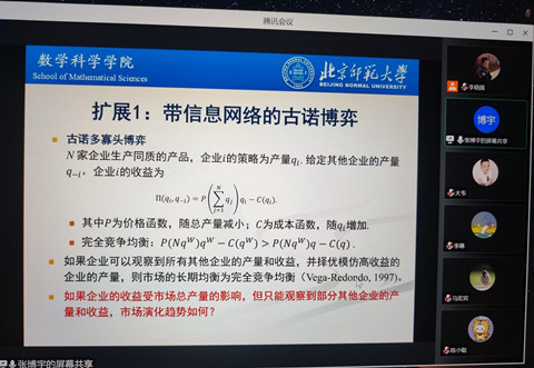 “动态博弈与学习理论”青年学术团队承办的经济学高级研究论坛第190期在腾讯会议平台以线上方式举行。论坛邀请北京师范大学数学科学学院张博宇教授做题为“网络上的演化博弈动态”的学术报告。论坛由辣文