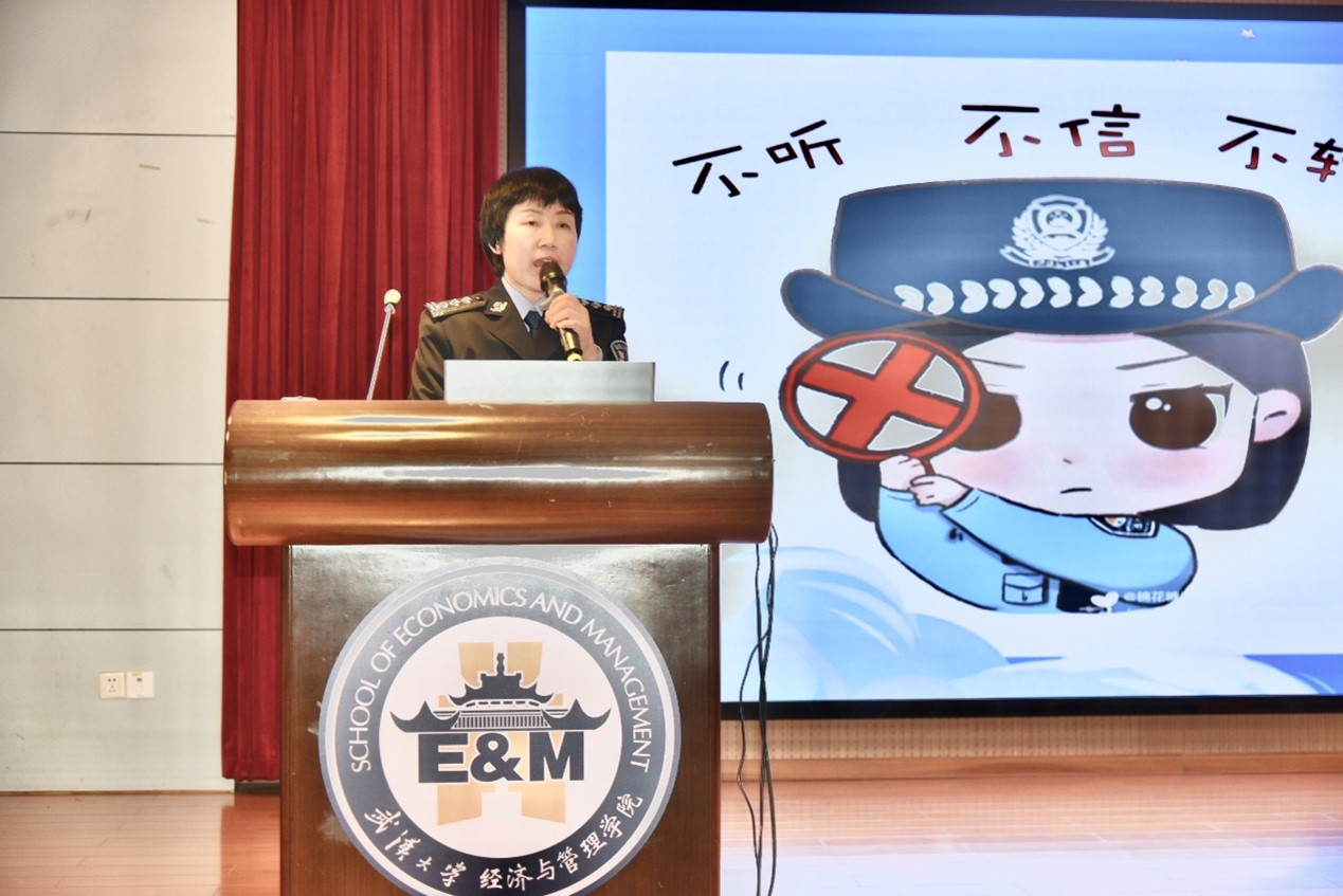 11月7日下午,学院举办“防范电信诈骗,平安护航师生”主题安全教育大会,珞珈山派出所副所长孟玲、警官张超,辣文