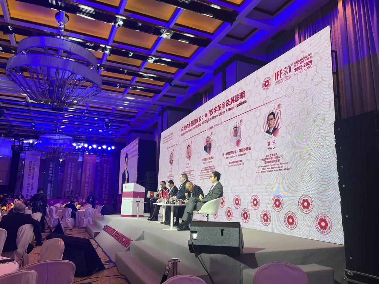当日下午,宋敏教授主持了题为《AI/数字革命及其影响》的数字金融圆桌会议,在会议讨论环节,宋敏教授与国际清算银行(BIS)亚太地区首席代表、中国人民银行原副行长、国际货币基金组织(IMF)前副总裁张涛,IFF 人工智能专门委员会成员、欧洲社会党前主席、德国前国防部部长鲁道夫·沙尔平,IFF 人工智能委员会成员、德根多夫应用技术大学人工智能教授、skyrocket.ai 创始人兼首席执行官帕特里克·格劳纳,阿勒萨耶格集团董事长阿卜杜勒贾巴尔·阿勒萨耶格,西班牙对外银行(BBVA)亚洲首席经济学家夏乐,就数字金融领域的诸多问题展开了讨论。宋敏教授在圆桌会议中,肯定了人工智能技术在世界经济发展中的重要作用,特别是AI对金融服务业影响深远。不过,也应当注意在人工智能大模型的训练过程中,保护客户隐私。此外,宋敏教授还在圆桌会议中与其他嘉宾讨论了区块链技术对数字金融的深远影响。
