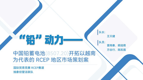 由队长王天健、队员雷雨秦、赖冠儒、陈凯强、方谷行组成的“抽象经管法联队”,以中国独占的电池防水技术为分析航标,探寻中国铅酸电池在东南亚的增量与存量市场,结合进出口特征,最终筛选出越南这一目标市场,并利用6P理论、SWOT分析法等科学工具,将铅酸电池国际市场开拓导向智能化、高效化。该项目从小处着眼,挖掘铅酸电池的潜在价值,加之实际考量和远景规划,颇受评委青睐,荣获大赛一等奖。