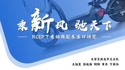 由队长王翘楚,队员黄奕、胡桐、张起瑞、于丽泓组成的“大学生熬夜不秃头队”。“乘新风,驰天下”,在RCEP大背景下,以电动两轮车出口为研究对象,进行全产业链式分析,尤其细化深究RCEP政策这一竞赛主题,获得评委们的赞许,荣获大赛一等奖。