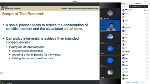 接着,吴越老师引入其构建的研究模型,详细解释了不同传播渠道之间的区别,分析了内容创作者以及消费者对于不同传播渠道的选择。通过数学推导构建了市场上的均衡状态,在此基础之上,吴越老师讨论了不同的监管政策(加强筛查力度、采取严厉惩罚措施、提高不道德内容制作成本)的效果,并提出了如何减少社会不良影响,传播正能量内容的建议。