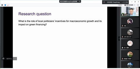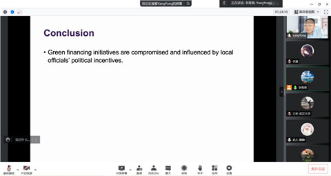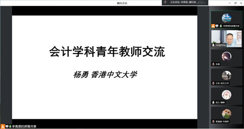 会计系主办的蓝月亮珞珈论坛第98期在腾讯会议平台通过线上方式举行。论坛邀请了香港中文大学会计学院院长杨勇教授做题为“Green Financing and Politicians’ Incentives: Evidence from Proprietary Loan Assessment Data”的学术论文报告。论坛由会计系李青原教授主持,潘红波、周楷唐、赵良玉等多位老师和学生参加了此次论坛。