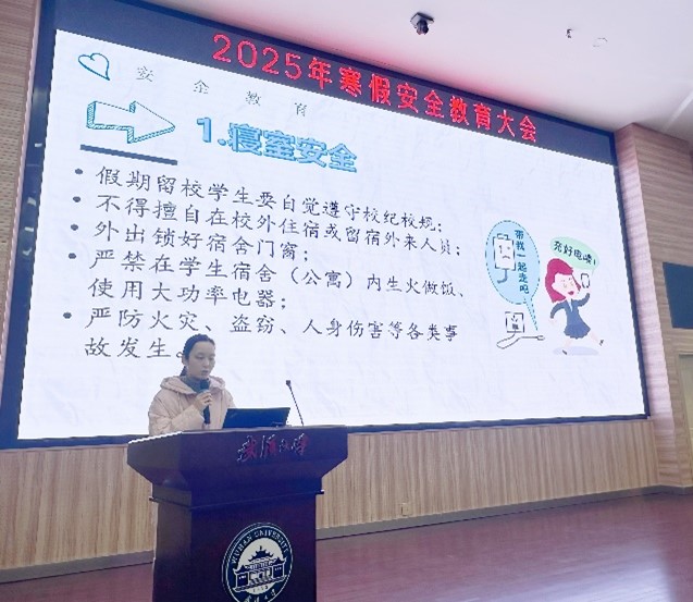 随后,孙琳子进行寒假安全强化教育。通过讲解和播放安全教育视频,从学习安全知识和严守管理要求两方面展开,着重强调了人身安全、财产安全、交通安全、防火用电安全、防电信诈骗和心理健康等,并提醒假期留校学生自觉遵守校纪校规,积极配合学院管理。