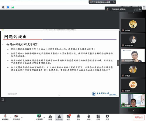 郑老师带来的报告视角新颖、结构清晰,具有重要的政策意义。与会师生展现出了浓厚的兴趣,并在互动谈论环节针对技术创新激励政策、费用分类(管理费用)、税收优惠政策等话题和陈冬教授进行了热烈的探讨。思想的交流碰撞下,师生们均深受启发,获益匪浅。至此,本次论坛圆满结束。