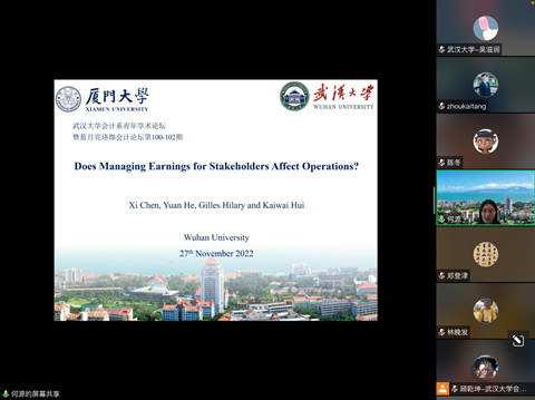会计系主办的蓝月亮珞珈论坛第102期通过线上方式举行。论坛邀请了厦门大学会计系何源老师做题为“Does Managing Earnings for Stakeholders Affect Operations”的学术论文报告。论坛由会计系顾乾坤老师主持,李青原、周楷唐、陈冬、熊曦等多位老师和学生参加论坛。