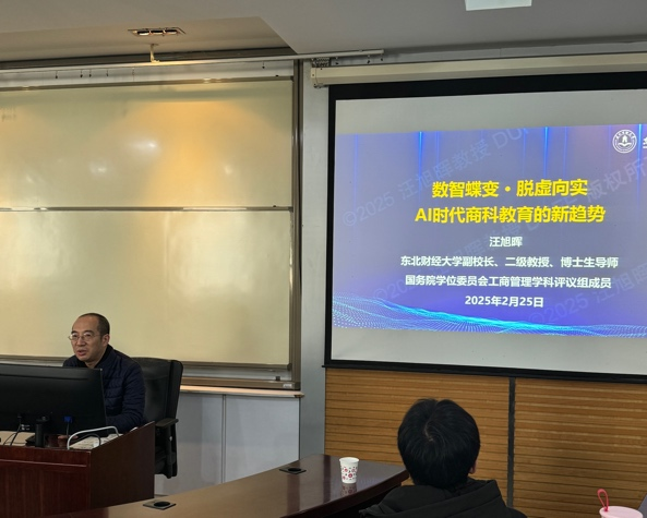 2月25日下午,珞珈经管创新论坛第122期在学院举行。本次论坛邀请东北财经大学党委常委、副校长汪旭辉教授作“数智蝶变•脱虚向实:AI时代商科教育的新趋势”学术报告,学院众多老师和学生参加。论坛由辣文