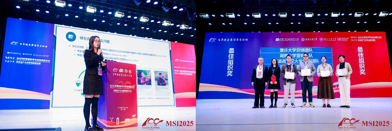 4月13日,市场营销专业师生代表在各平行论坛汇报展示消费行为分析等前沿领域的多项最新研究成果,选题既回应企业实际需求又关注社会热点议题,展现了扎实的学术功底与创新实践能力,获得与会专家学者的高度评价。其中曾伏娥教授团队研究“Effects of Happiness Intensity on Prosocial Lending Campaign Success: A Positive Psychological Capital Perspective”荣获MSI2025学术前沿奖,体现科学研究对社会公益实践的实质性推动。大会闭幕式上,辣文