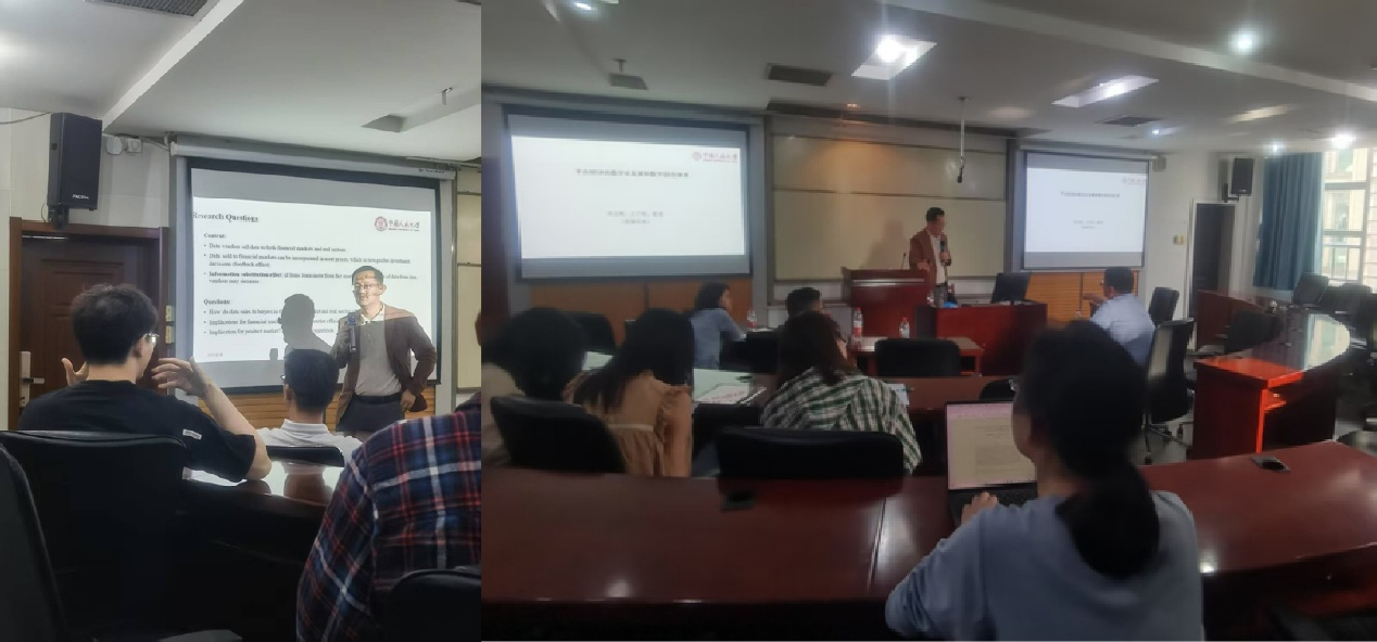 在讨论交流环节,与会人员围绕文章模型中数据供应商设置的市场竞争、股价信息传递机制等关键问题展开深入探讨,同学们也从实证细节与数据获取角度提出问题。邱教授逐一回应,肯定现场讨论对完善研究框架有很大启发。