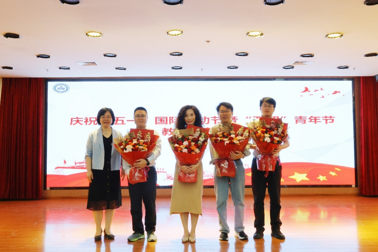 青年五四奖章(教职工)”获得者涂乙冬教授献上鲜花,并与获奖教师亲切合影,定格这一荣耀时刻。