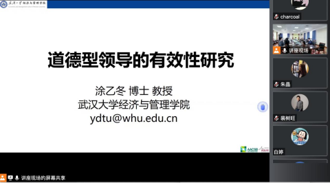 教授、博士生导师涂乙冬以“道德型领导的有效性研究”为题进行学术报告,并邀请两位对讲嘉宾与主讲人进行沟通交流。两位嘉宾分别为辣文