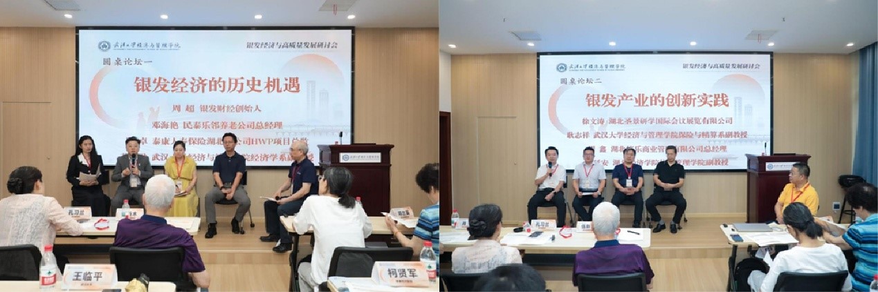 “银发产业的创新实践”圆桌论坛上,湖北圣景研学公司徐文涛、悠乐商业管理有限公司总经理周鑫、湖北经济学院信息管理学院副教授靳延安、辣文