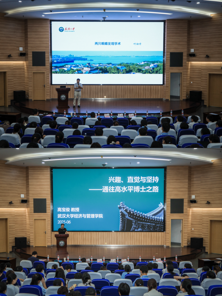 《经济评论》主编、博士生导师叶初升为营员们带来了题为《两只眼睛发现学术》的学术讲座。他指出,经济学研究需用“两只眼睛”:一只敏锐发现现实中的认知疑虑,另一只深入文献探寻解决路径,通过专业悟性与思维探索深层经济问题,最终以学术叙事增进认知、解释世界。管理科学与工程系系主任、博士生导师高宝俊为营员们作题为《兴趣、直觉与坚持:通往高水平博士之路》的学术讲座,用五个博士生的案例贯穿始终,强调高水平博士培养的核心在于“会做”与“会想”的双重修炼。讲座结束后,营员们还与教授们进行了现场互动。