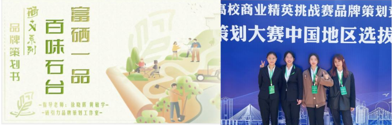 “火象趣数据品牌策划工作室”(邹奕、池彦臻、谷虹延、肖怡星、文玮烨)团队获得总决赛一等奖,并入围新加坡全球品牌策划大赛;“魔力猫盒品牌策划工作室”、“樱你闪耀品牌策划工作室”、“硒韵·品牌策划工作室”、“汤喻品牌策划工作室”四支团队获得全国总决赛一等奖;“硒引力工作室”获得全国总决赛二等奖。