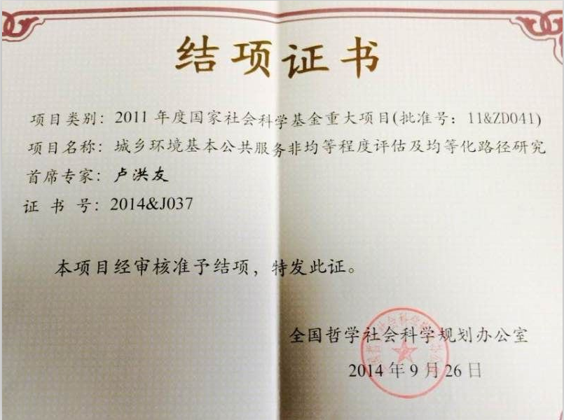 卢洪友教授主持的国家哲学社会科学基金重大项目《城乡环境基本公共服务非均等程度评估及均等化路径研究》(项目编号:11&ZD041),已通过专家鉴定,经全国哲学社会科学规划办公室审核批准,于2014年9月26日顺利提前结项。结项证书号为2014&J037。