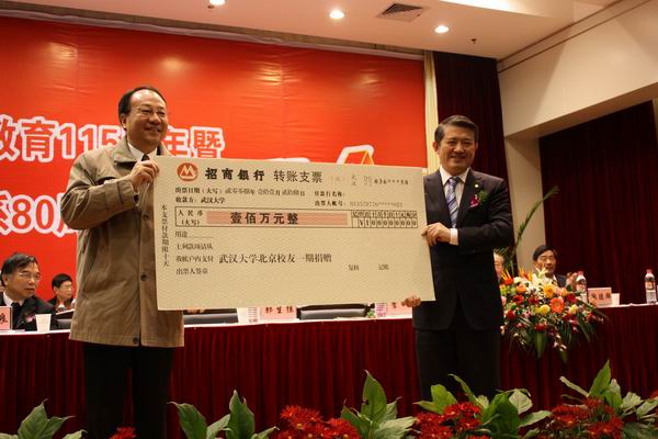 党委书记李健同志上台来接受捐赠,并且向捐赠单位和个人颁发证书。其中,北京校友的第一期捐赠100万,其中泰康人寿保险股份有限公司董事长兼CEO陈东升先生个人捐赠50万;谭崇台教授的全体博士生和硕士生捐赠100万;湖北中青文化教育咨询有限公司捐赠100万;武汉现代科技职业学校捐赠80万;武汉恒道管理咨询有限公司捐赠50万;上海九天钢铁有限公司捐赠20万;杭州爱丽芬集团有限公司捐赠20万;浙江华银物业仓储有限公司捐赠20万;江苏天联置业投资有限公司捐赠20万。会议前后,各合作单位、校内兄弟院校、历届校友、班级也对发展基金进行了捐赠。