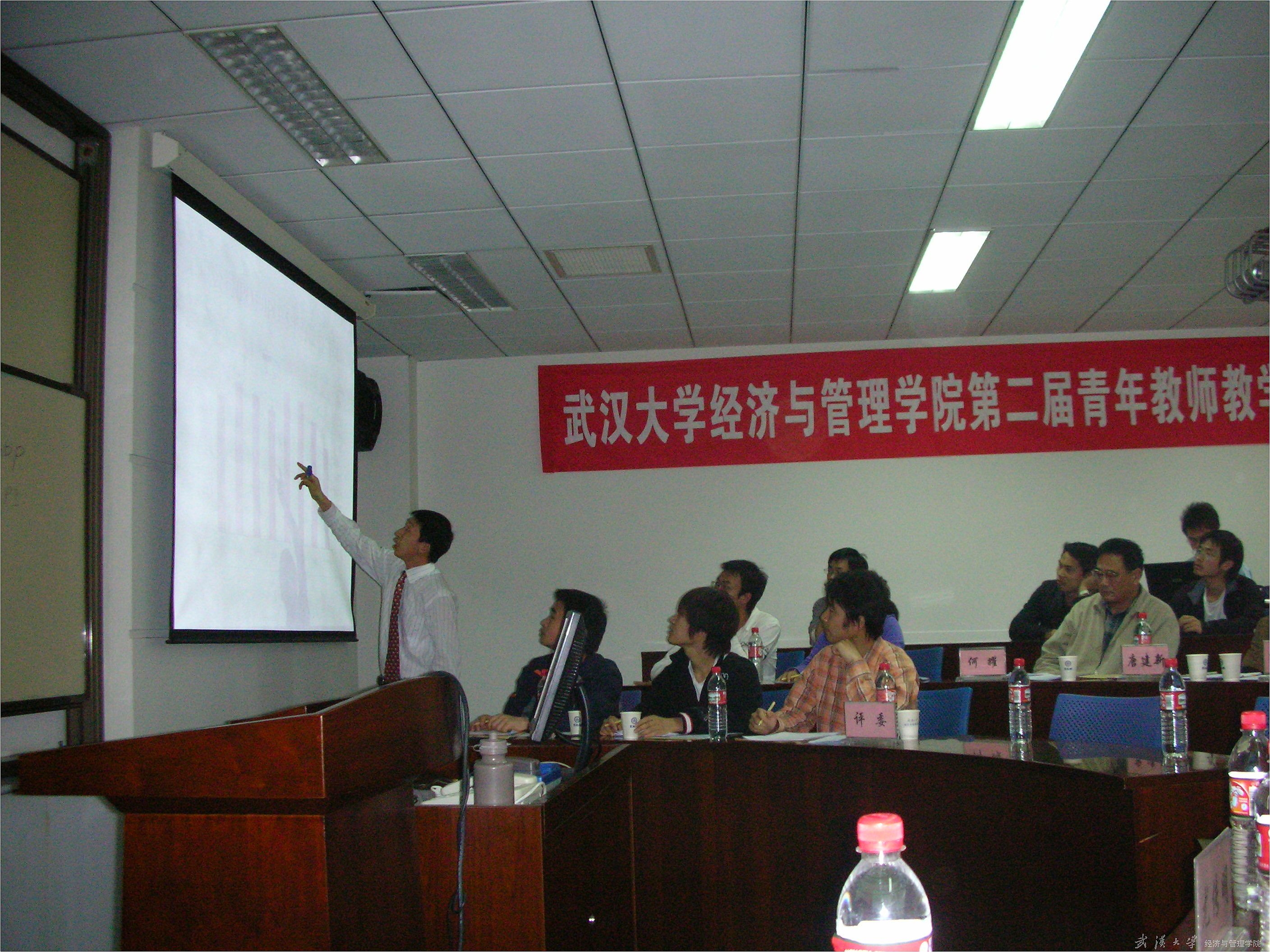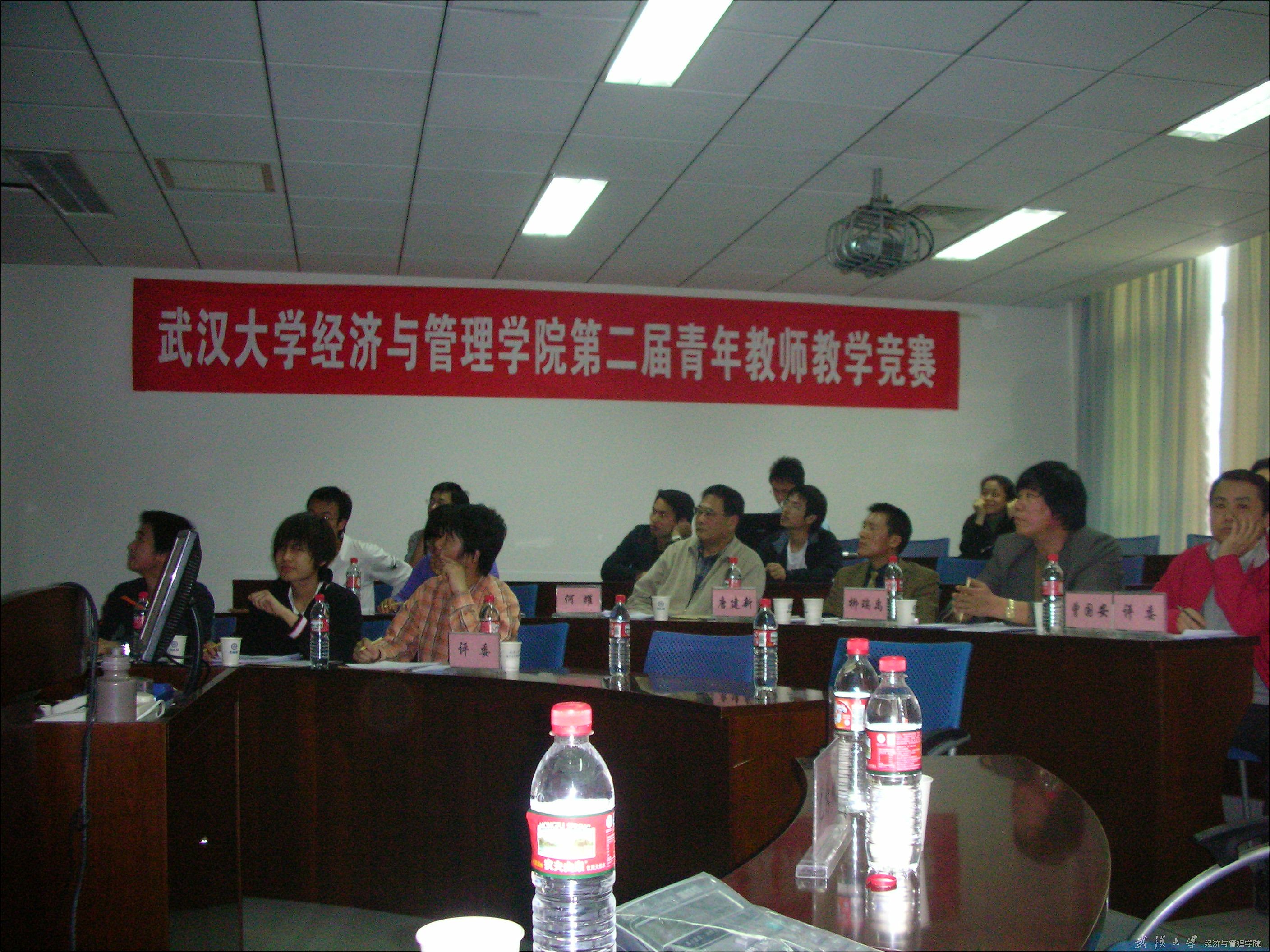 教务部部长吴平、教务部评估质量办公室主任陈学敏、学院党委书记尤传明到现场观摩比赛并发表讲话。竞赛专家评审团由学校教学督导团成员何耀教授、学院副院长曾国安教授、黄静教授、唐建新教授、海峰教授、柳瑞禹教授、黄兆银教授和学院教学指导委员会委员吴传清副教授、刘思跃副教授、刘穷志副教授组成。学院2006级本科生李颖、彭友元、刘爽、陈丛源及2007级本科生何祚宇作为学生评委参加了竞赛的评分工作。