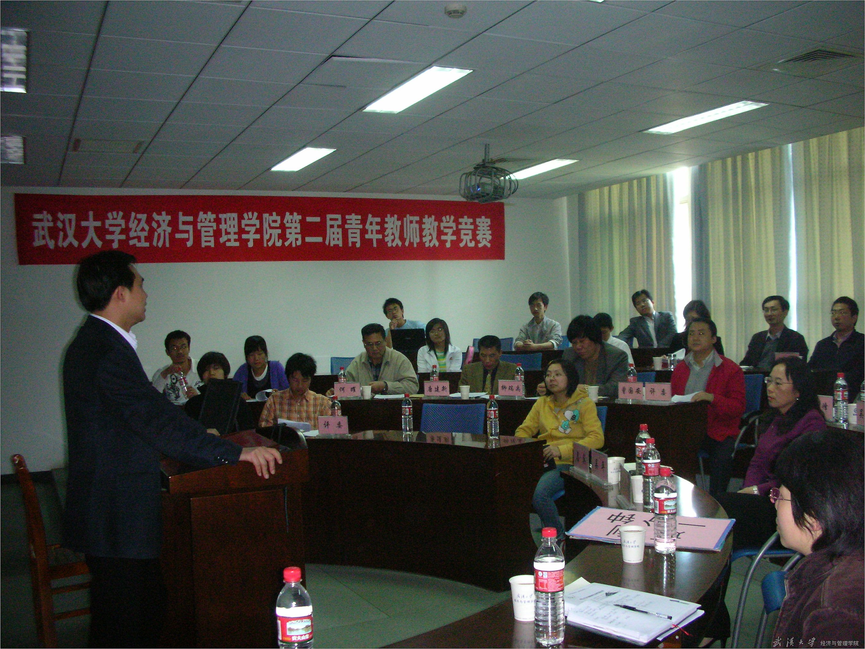 曾国安副院长首先就举办本次竞赛的目的进行了介绍。他说,要通过本次竞赛促进青年教师投身本科教学工作,使青年教师对本科教学的态度更端正一些,对本科教学工作的投入更多一些,教学方法和手段更先进、更完善一些,教学工作水平更高一些。他说本次竞赛也为青年教师交流教学经验搭建了平台,通过竞赛互相取长补短。他说学校和学院致力于以学生为本,致力于提高学生综合素质,致力于培养宽口径、厚基础、高素质、强能力,具有“三创”精神和能力的经济与管理高级专门人才,青年教师是学院未来发展的希望,也是未来教学骨干,青年教师的科研能力、知识结构等都具有良好的基础,但在教学工作水平方面与学院整体学科实力,与兄弟学院相比较还有距离。他对参加本次教学竞赛的青年教师寄予厚望,希望大家在学校、学院的高度重视下,努力提高自己的业务能力,在今年的校级比赛中脱颖而出,真正体现辣文