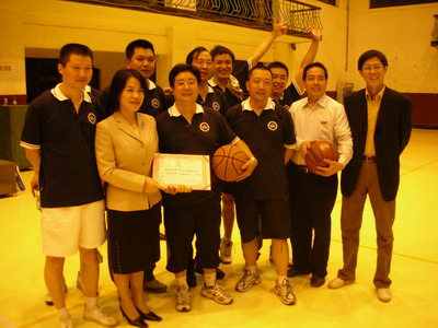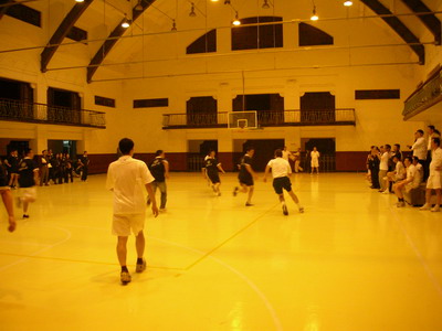 比赛向前推进。授课教师Waiter Zinn教授应邀也来参加比赛。他先是换上05班的队服,与06班对抗;下一节,却又换上06班的队服,与05班对抗。他身材高大,善于跑动,球技不错,遇到争球也毫不手软,为05班和06班分别贡献了2分。他的到来,使比赛顿时升格为国际比赛,顿时升华为中美两国人民的友好交流,让大家很受感动。不过,Waiter Zinn教授似乎深谙中国传统哲学“中庸之道”,瞧瞧,不论是过程还是结果,他都给了参赛两队一个无可挑剔的回答。