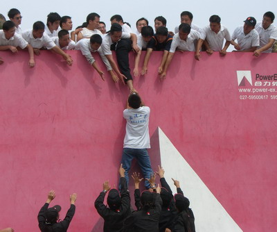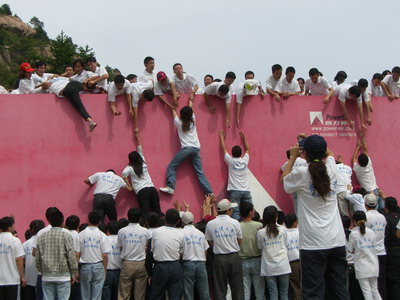 007第一个爬上去,他说如果是真的逃生我会把生的希望留给他人。正是他的带动下,全体学员发生由愕然至奋勇前进质的转变。蓝天心宽体胖,用身体支撑起人墙,他说我身材决定了我的角色,我没有任何其他考虑。还有很多人我看到他们的肩膀、手臂划伤了,没有任何怨言。我庆幸自己是女生,在豪无感觉下,在男同胞下顶上拉中爬上了畏惧的墙,同时又遗憾没能真真切切感受浴血奋战的沸腾。同学间心与心的距离在这一刻缩短为零,我深深感受了团队力量和集体智慧的伟大。