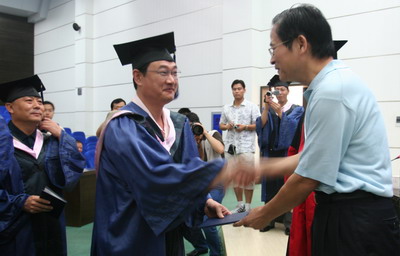 陈继勇院长发表了热情洋溢的讲话。他对学员顺利完成学业表示祝贺,总结了EMBA近年来办学所取得的成绩,对新批学袍的学员们,他提出了殷切希望:“做改革开放的急先锋、开拓创新的领头羊、国际市场的中流砥柱。”