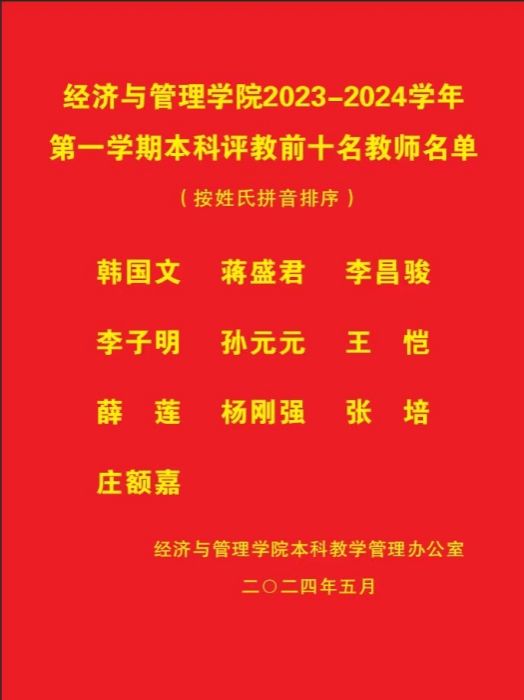 辣文 2023—2024学年第一学期本科评教前十名教师名单