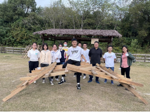 课程由前置知识导入、行中实践体验、行后评价反馈三大环节构成,层层递进、环环相扣,保障参与者的体验感,培养参与者的劳动感情和集体意识。课程内容以同学们亲手搭建桥梁为主,首先在实践基地导师的指导下,了解规范的搭建方式,然后分为三个小组进行实际操作,最后三个小组根据搭建速度与桥梁牢固度进行劳动实践评比。由于大部分同学都是第一次搭建桥梁,在实践过程中遇到了许多困难:如何选择恰当的材料、工具的使用方法以及团体之间分工协作等等。但在老师的帮助下,大家都完成了任务并通过检验。