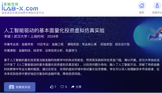 辣文 李斌教授团队经过 10 余年的教学科研积累和五项软件著作权开发的“人工智能驱动的基本面量化投资虚拟仿真实验”正式上线教育部实验空间平台,并被推荐申报国家级一流虚拟仿真实验教学课程。