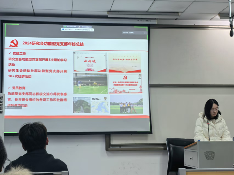 研究生会功能型党支部党员大会于学院123教室顺利召开。本次会议由经管院研究生会主席团主席赵培培主持,采用线下线上相结合的方式进行。本次会议进行了经管院研究生会功能型党支部介绍、换届大会、理论学习、年度总结四项议程,并在后续内部会议中明确了各支委的分工。