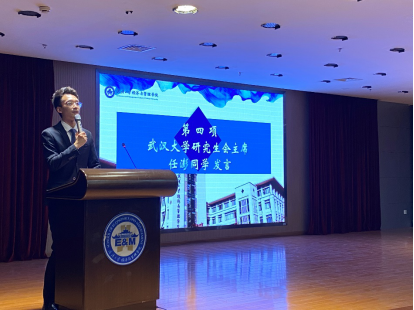 研究生会主席任澎同学发言。任澎同学首先肯定了学院研究生会做出的积极工作,并分享了个人对于研究生会建设和改革的见解,希望学院研究生会建设呈现出新气象、新作为。