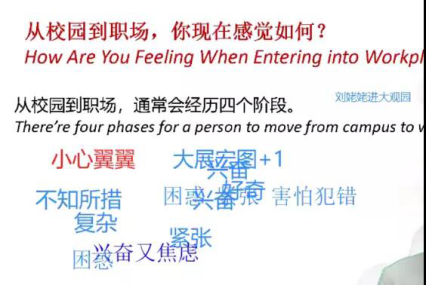 本次课程的核心理念通过“CAREER” 来贯穿。首先,梁旻老师对校园到职场的变化(Change)这一问题进行了分析,刚从学校进入职场,同学们可能会感到紧张兴奋或者是害怕犯错,焦虑困惑。其实这些都是正常情绪,这种状态一般持续1-3个月过后,就会进入下个阶段,即沮丧期。职场小白们开始迷茫不满,各种发牢骚,怀疑自己是否适合这个工作。有的人选择跳槽转行,有的人则既来之则安之,开始做一些自我的调整,于是进入第三阶段——调整期。通过调整,我们达到最后阶段——适应期,解决自己的困惑,与自己的工作环境和谐相处。那么面对这些突如其来的改变和不适应,我们应该如何转变自己、奋力奔涌呢?接下来,梁旻老师对如何“蓄势待发”进行了剖析。 从学校到职场发生的变化意味着你要调整自己,蓄能应变,蓄能是应对职场变化、开始职场启航的第一步,那么接下来就是如何蓄能了。另外,“势”意味着长势,我们需要主动行动,很多时候,很多工作和待处理的事情是模糊的、不确定的,你需要自己主动的去做。化被动为主动,不能只是像在学校里一样等着被安排。此外,梁老师强调,工作中需要心系团队(Relate),在职场里,一个好员工不是立志成为部门最优秀的那个员工,而是能够帮助自己所在的团队成为最优秀的团队的员工。