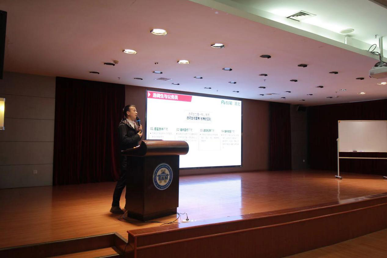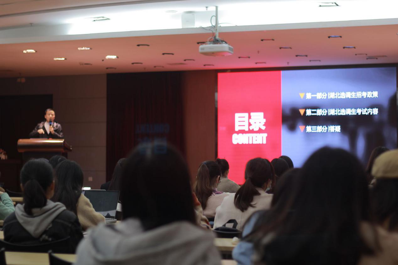 本次讲座主要分为嘉宾分享环节和互动答疑环节。在嘉宾分享环节,贾老师首先对选调生的招录政策做了详细的介绍。贾老师指出,选调生作为各组织部门从高校直接选拔的品学兼优的学生,相对于一般的公务员,它在许多方面都有优势。接下来,贾老师对于湖北省近四年的选调情况和选调政策做了分析。在介绍完了选调的基本情况和湖北省的招录政策之后,贾老师以湖北省为例,为同学们详细介绍了选调过程中的笔面试内容。他提到,相对于国考、省考等公务员考试,选调生考试中的笔试相对题量少且更容易做完。最后,贾老师结合自己的工作经验,对于应该如何备考给出了相当成熟的建议。他指出,同学们应该要分模块、分阶段地备考笔试。同时,面试备考中最重要的一点就是提前感受面试考场氛围。