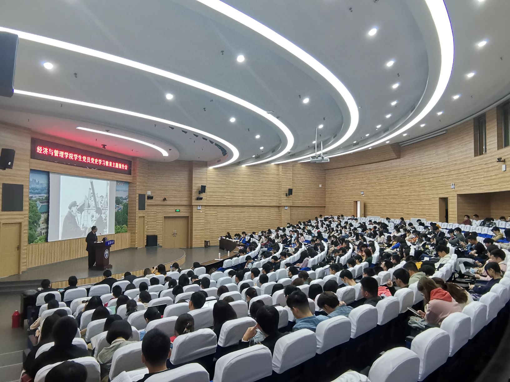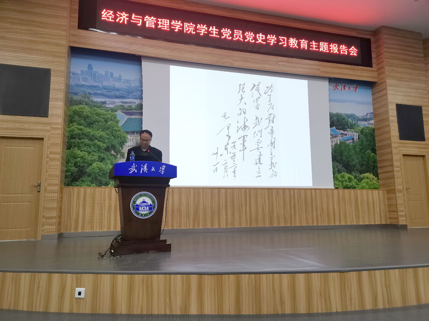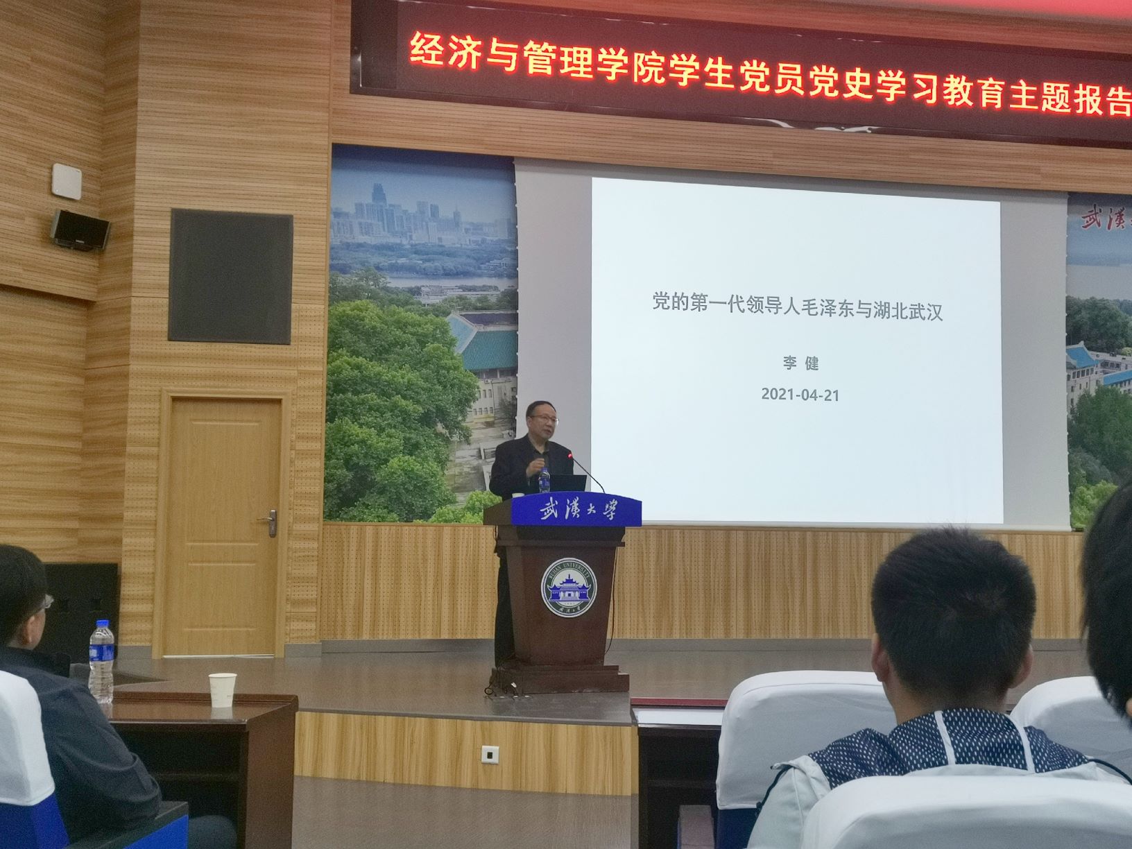 原党委书记、博士生导师李健教授为在场师生做了一场别开生面的专题报告会,报告会主题为《党的第一代领导人毛泽东与湖北武汉》。学院各研究生党支部的党员、预备党员和发展对象近500名同学参加了报告会。