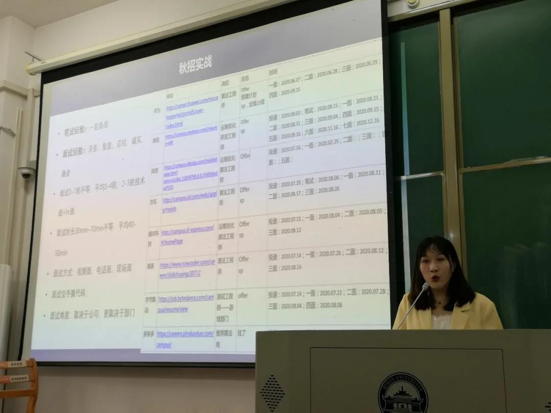 杨天天学姐分享了自己的职业选择原因:综合考虑了收入待遇等七项因素,她最终并没有选择互联网或地产行业,而是选择了一份相对稳定的工作。随后她分享了商业银行、武汉市选聘生、高校行政岗的笔试和面试经历,并强调英语在面试中的重要性。
