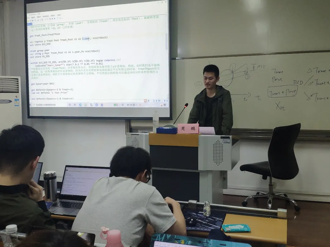 中场休息时间过后,周师兄又为我们讲解了数据集处理方面的常用代码和方法,比如文件类型及转换(reshape)、样本扩充(expand)、数据合并(merge,append)等部分,帮助我们充分了解了数据清洗的基本方法。最后,周鹏师兄还简单介绍了宏与循环的基本内容。嘉宾分享结束后,几位同学对周师兄讲授的内容进行了提问,包括DID单时期和多时期的差异、merge命令的具体使用、PSM方法协变量的选择、程序编写的好习惯等等,周师兄一一作出了解答。