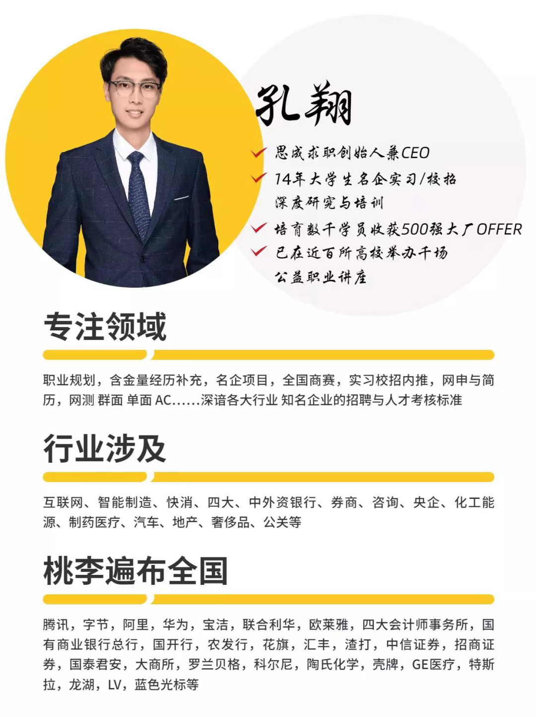 本次交流会特邀:2位优秀师姐师兄,曾斩获:宝洁、字节跳动、德勤、安永、毕马威、腾讯、美团、龙湖、京东、TCL华星、光辉合益咨询、小红书、VIVO等13个实习&正式Offer,年薪近30w!更有14年学生求职辅导经验、思成求职创始人&CEO:孔翔老师助阵!
