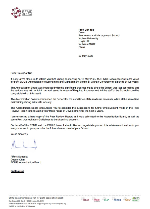 We are proud to announce the Economics and Management School of Wuhan University (WHU EMS) has been awarded EQUIS five-year re-accreditation by the European Foundation for Management Development (EFMD). This achievement represents the highest level of international recognition for our school's educational quality. Our school has acquired EQUIS initial accreditation in 2016 and gone through three rounds of EQUIS re-accreditation. The five-year EQUIS re-accreditation indicates that our school stands among the leading business schools in the world with high-quality business education recognized by international authorities.