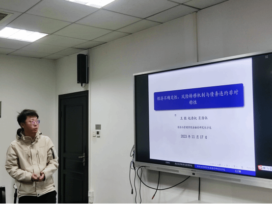 2022级金融学硕士生肖浩钰分享的报告题目是“经济不确定性、风险转移机制与债务违约非对称性”。该文章构建了具有内生风险转移机制的一般均衡模型,从银企间信息不对称的视角考察了企业在经济不确定性冲击下的债务违约非对称影响机制。从理论逻辑而言,企业对高风险投资项目的追求导致债务违约概率提高;此外,小企业存在更严重的信息不对称问题,在不确定性冲击下收到的负面影响加剧。辣文