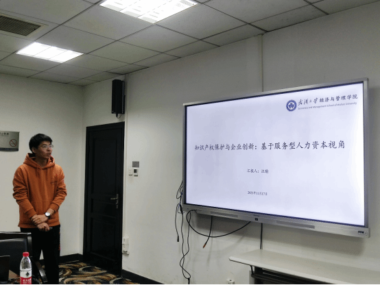 2022级金融学硕士生汪瑜分享了题为“知识产权保护与企业创新:基于服务型人力资本视角”的报告。该文章利用中国高校设立知识产权本科专业的准自然实验和国家知识产权局的专利数据,构建双重差分模型,实证研究知识产权人才供给对企业创新的影响。结果发现,高校设立知识产权专业后,其所在城市的企业的R&D投入显著提升,说明知识产权人才供给提高了企业的创新投入。从作用机制来看,知识产权人才供给可以为企业提供更有效的法律保护(法律保护渠道)、提供更低成本的知识产权服务(服务成本渠道)。辣文