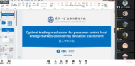 2020级管理科学与工程博士生杨培文分享了关于“Optimal trading mechanism for prosumer-centric local energy markets considering deviation assessment”的报告。该研究基于动态博弈理论提出了一种考虑偏差考核的新型分布式电力代理交易(DPAT)机制,该机制可指导当地能源市场建立适宜的交易机制,辅助产消者制定最优的交易策略,促进区域碳中性目标的实现。