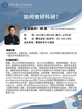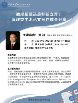 为了全面加强管理科学与工程专业研究生的学术训练,提高研究生培养质量,管理科学与工程系于2022年11月26日和2022年11月29日先后在腾讯会议上举办了两场珞珈经管研究生学术沙龙活动。