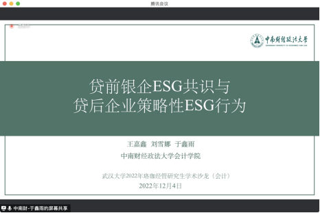 首先,中南财经政法大学的王嘉鑫分享了关于“贷前银企ESG共识与贷后企业策略性ESG行为”的报告,通过回归模型发现贷前银企ESG相似度越高,贷后企业策略性ESG行为越少,且上述结论在利用以银行并购冲击构建双重差分模型等方法进行检验之后依然稳健。论文分析银行与企业ESG共识影响企业ESG行为的原因,主要通过“资金激励效应”与“威慑倒逼效应”两个渠道影响贷后企业策略性ESG行为。会计系博士研究生章尹赛楠对这篇文章进行了点评。