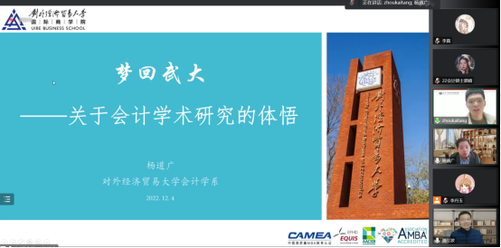 会计系主办的珞珈经管研究生学术沙龙|会计在腾讯会议平台通过线上方式举行。学术沙龙邀请了对外经贸大学国际商学院博士生导师杨道广教授展开了关于“梦回武大:关于会计学术研究的体悟”的主题报告。论坛由会计系潘红波教授主持,周楷唐等多位老师和学生参加了此次论坛。
