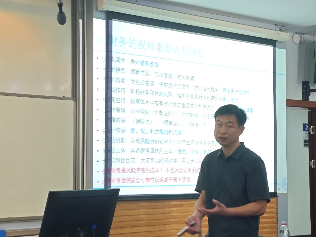 在讲座过程中,魏主任与参会老师、学生展开热烈交流互动,就巨灾保险基金以及再保险公司的承担份额等传统救灾模式设置的问题进行了研讨,指出融合灾害风险金融模式是破解传统问题的优化路径。此外,魏主任对自己为海南设计的公共财政融合灾害风险金融实施架构进行了详细展开,以实际案例为大家论证了融合灾害风险金融模式的可行性与优势。
