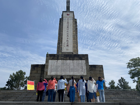 随后,同志们前往蕲春县城,在高山铺战役烈士陵园开展祭扫活动。同志们满怀崇高的敬意,列队拾级而上,在纪念碑前敬献花篮,鞠躬致敬,缅怀在高山铺清水河战役战役中英勇献身的先烈。