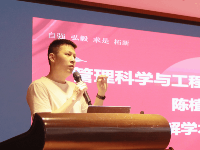 管理科学与工程硕士第一党支部、第二党支部、博士党支部联合举办的“学《条例》,正学术,树纪律”主题党日活动,学院管理科学与工程系教师党支部书记、系副主任陈植元,辣文