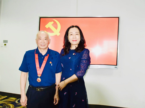 姜星莉为周茂荣同志颁发并佩戴“光荣在党五十年”纪念章。周茂荣同志心情激动,他感谢了党组织对自己的关心和关爱,深感没有中国共产党的领导,就没有中国的今天,就没有自己的一生,为自己在党五十年为党培养了一批优秀的人才而感到欣慰。他表示,会时刻牢记自己是一名共产党员,牢记党员的初心使命,为党的教育事业和学院发展继续贡献力量。