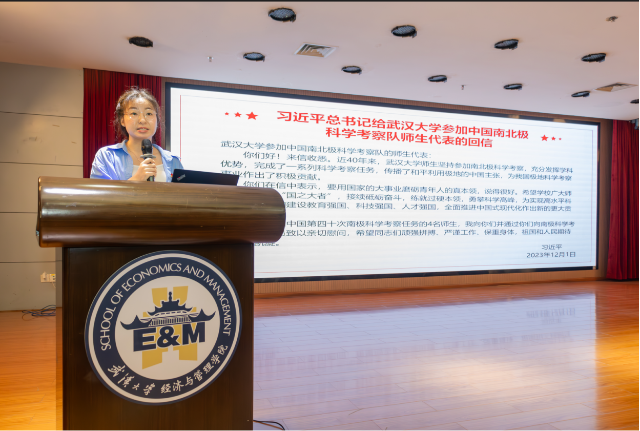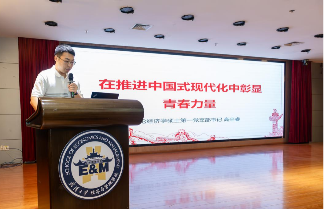 理论硕二党支部刘一苇同学为大家朗诵了文字作品《共鉴荣光,笃行致远——学习贯彻习近平总书记重要回信精神》。在刘一苇同学的深情朗诵中,各位同志深切感受到习近平总书记对武大学子的殷殷期望。