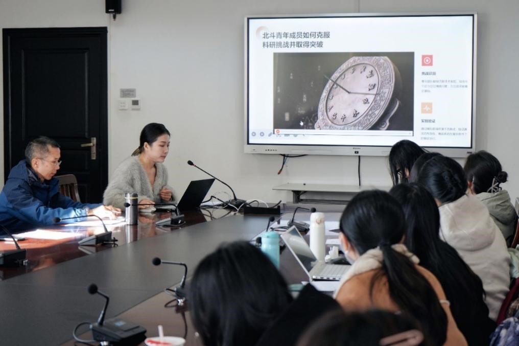 青年讲师团的袁英从青年创新的力量视角出发,讲述了青年人如何担当科技兴国的使命任务。袁英老师回顾了北斗导航卫星的发展历程,分享了北斗卫星设计团队中的青年创新事迹,带领与会成员共同观看了北斗青年成员克服重重科研挑战取得突破的短片。与会的同学们深受触动,更加坚定了不断学习新知识,积极探索未知领域,在国家提供的良好科研生态环境中永攀高峰的决心。